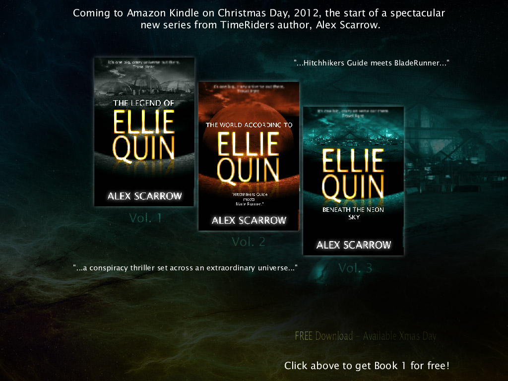 ELLIE QUIN is the big thing I'm working on right now (as well as the last two books for TimeRiders). Actually, if I may, I'd like to encourage TimeRiders fans to give my new series, ELLIE QUIN, a go. It's very similar to TimeRiders in terms of pace, big ideas, strong likeable characters. It's about a very ordinary girl who yearns to escape a boring rural existence on a remote agricultural planet. But soon becomes embroiled in a universe-spanning conspiracy. She finds herself on the run through this madcap, colourful, vibrant universe full of really fun ideas. For instance....pets you can grow from seeds, nail varnish that when it dries you can watch TV on your finger, genetically engineered labourers with four arms, weird fortune telling aliens, soda pops that change flavour all the time, plants with a cabby attitude!....lotsa fun stuff in a big, big, universe. The series has just been launched on Amazon. You can download it as an ebook or order (soon) a printed version from Amazon. If you're interested in learning more about it go to www.elliequin.com